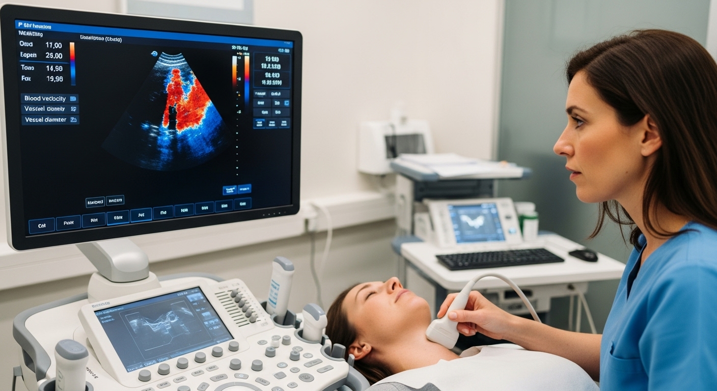 O Doppler de carótidas (e vertebrais) é um ultrassom do pescoço que avalia, em tempo real, as artérias que levam sangue ao cérebro. Ele mostra a parede do vaso, identifica placas de gordura (aterosclerose) e mede o fluxo sanguíneo (velocidade e direção).