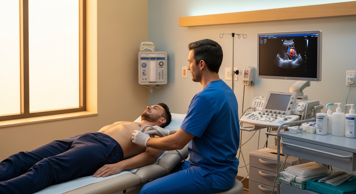 O ecocardiograma é um ultrassom do coração. Com um transdutor apoiado no peito e gel condutor, geramos imagens em tempo real das câmaras (átrios e ventrículos), das válvulas (mitral, aórtica, tricúspide, pulmonar) e dos grandes vasos próximos ao coração.
